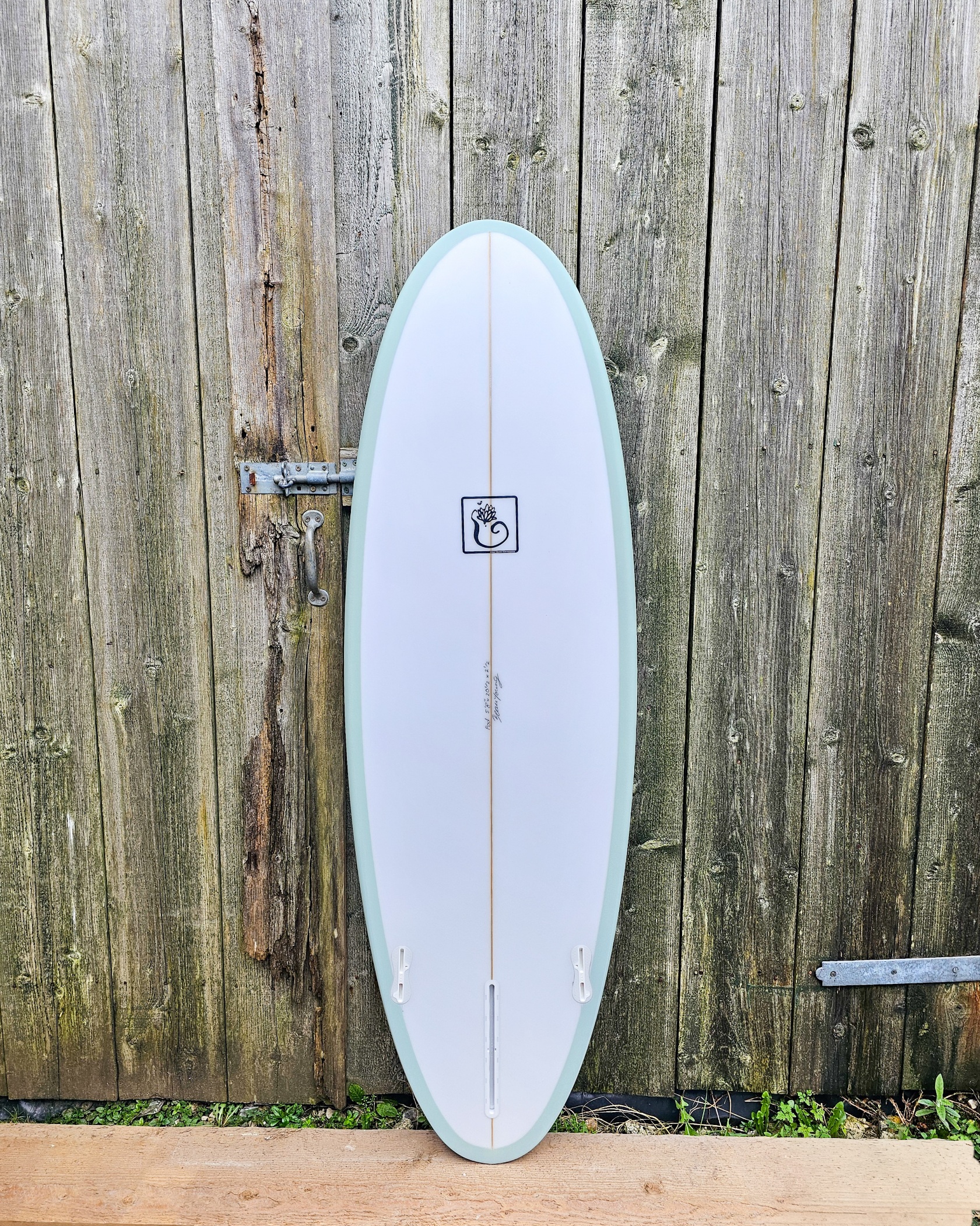 Sage green opaque resin tint with clear bottom and FCS2 side fin plugs.